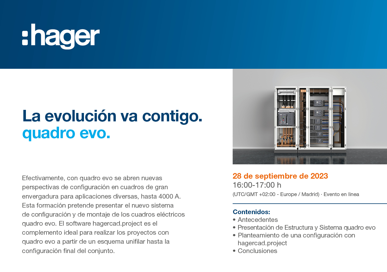 Esta formación pretende presentar el nuevo sistema de configuración y de montaje de los cuadros eléctricos quadro evo. El software hagercad.project es el complemento ideal para realizar los proyectos con quadro evo a partir de un esquema unifilar hasta la configuración final del conjunto.